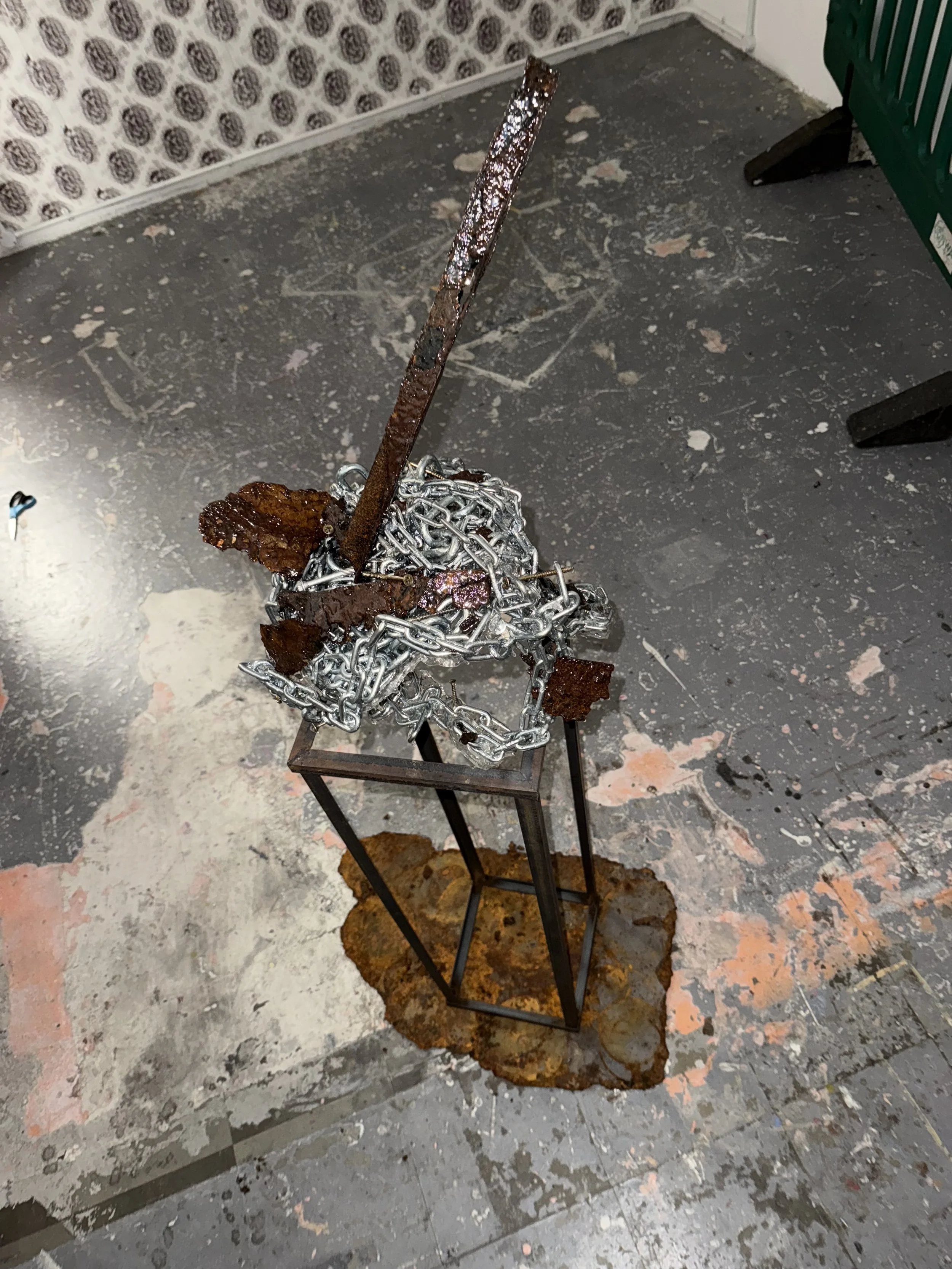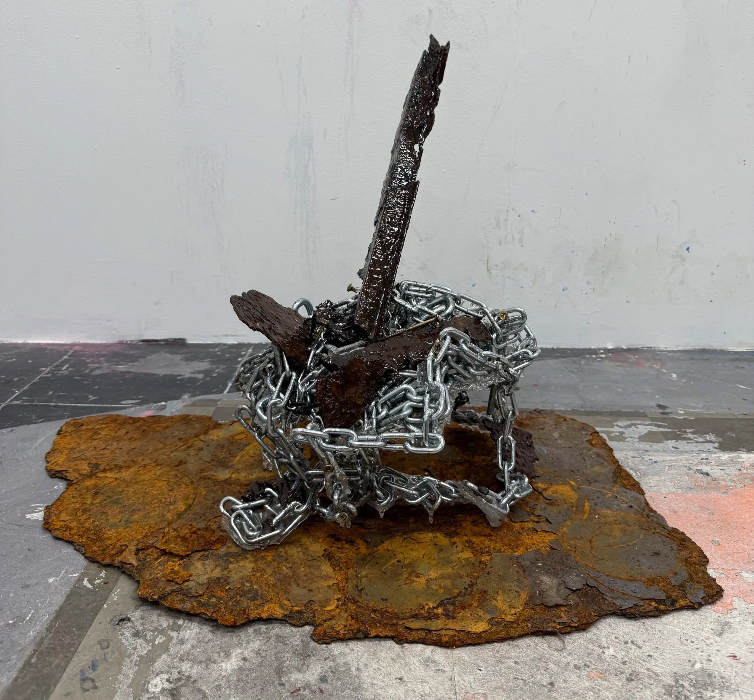 RUST (2025)JUNE 2025, SCULPTURE, 41CMX27CMX 11CMMETAL CHAINS, RUST METAL, RESIN, ICE, SCREWS AND BOLTS